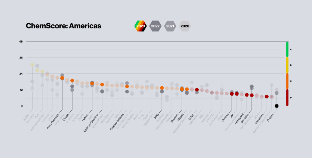 The inclusion of many PFAS substances to the SIN List meant that ChemScore added four new companies this year: Chemours, Honeywell, AGC and Daikin.